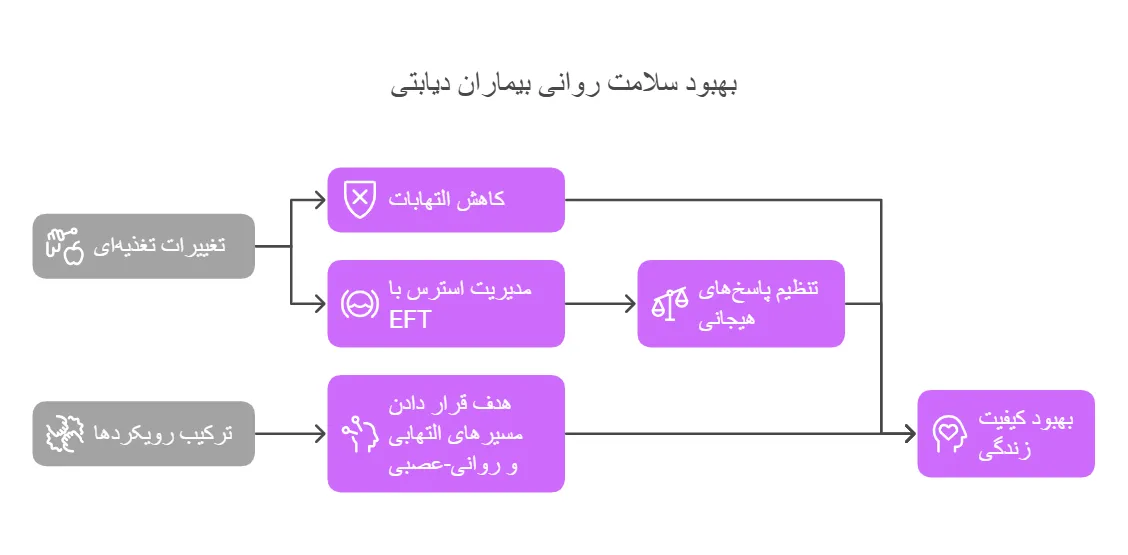 - ترکیب رژیم ضدالتهابی و EFT، مسیرهای التهابی و روانی-عصبی را همزمان هدف قرار میدهد که منجر به بهبود پایدارتر سلامت روان و کنترل قند خون میشود.
